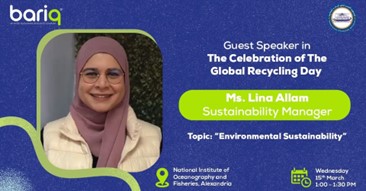 We are very proud at #Bariq to participate in the IOC-NIOF committee (Egypt) international workshop entitled “Global Recycling Day” which will be held on the 15th of March, 2023 under the auspices of Prof. Amr Zakaria Hamouda, President of the National Institute of Oceanography and Fisheries (NIOF -Egypt) المعهد القومي لعلوم البحار والمصايد. Ms. Lina Allam, Sustainability Manager was our keynote speaker in the workshop under the theme of “Recycling in Egypt” where she delivered a session on “Environmental Sustainability”. The workshop theme is considered among the very important issues related to environment and is organized by IOC-Egypt and IOC-Africa.